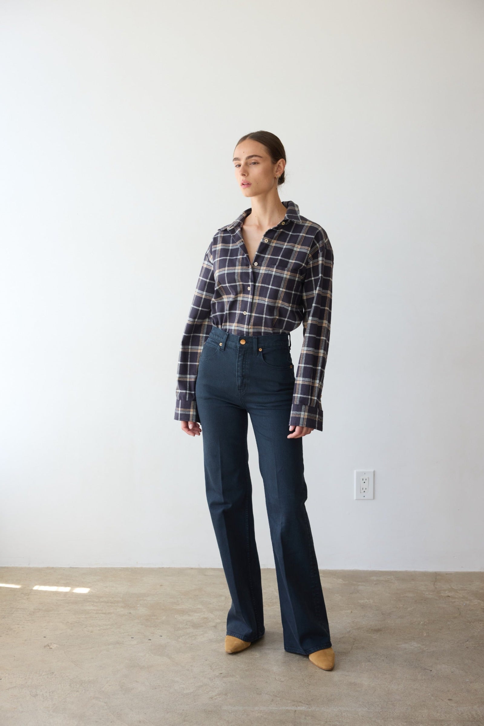 An elevated denim flare that does the long and lean look well. A leg shaped like a narrow A. A leg that elongates. The shape that leans. A 33 1/2” inseam that puddles with a flat and skims with a kitten. A 12.5” high mid rise that accentuates the natural waist. A silhouette that you fall in love with, and loves you back with it’s 1% stretch.