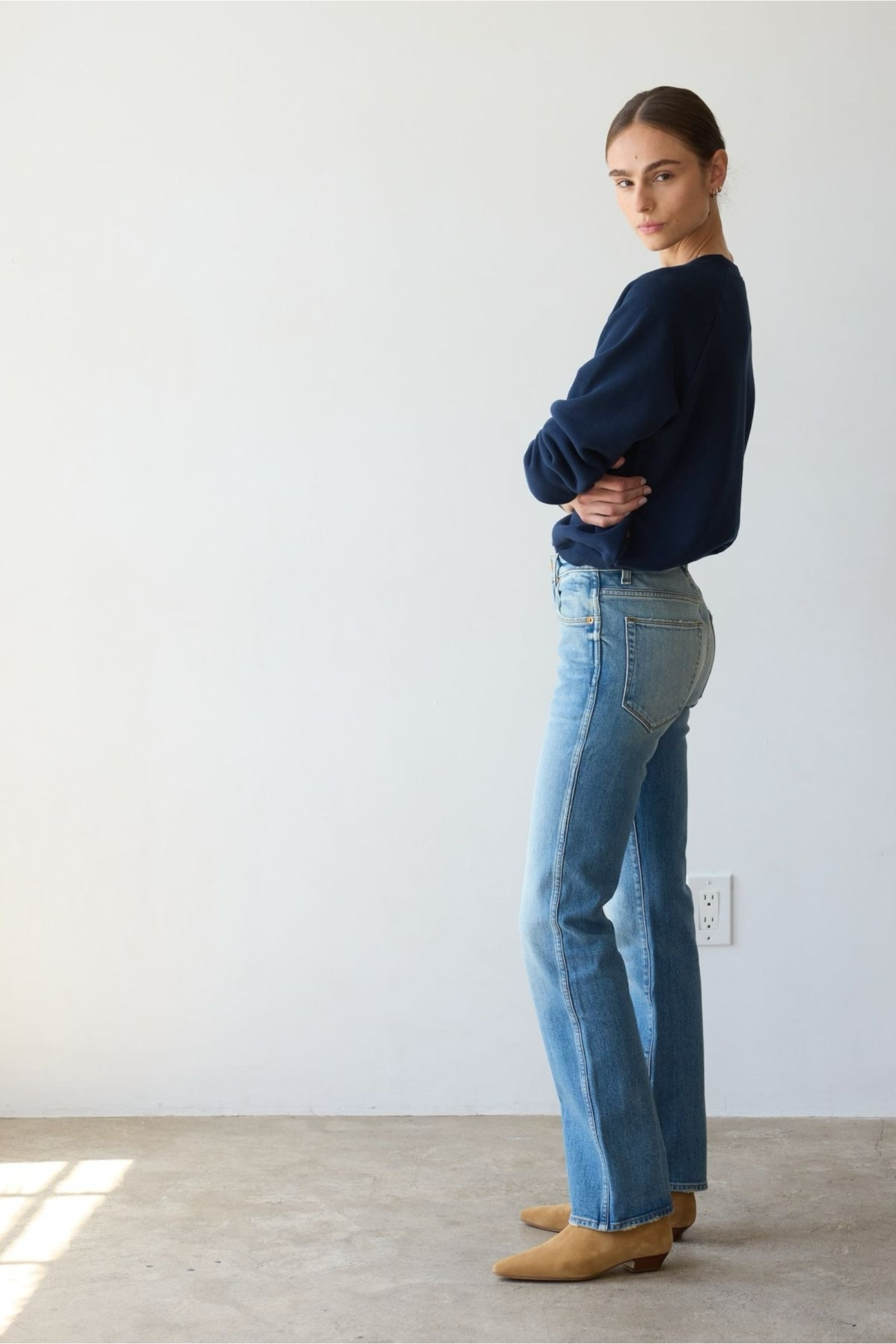 Named after a rock god, the Freddie is a true mid rise at 9 3/4". A long and lean straight leg stretch denim jean with a 30" inseam. Expertly cut for a straight and slimming shape with side seams that elongate. Double needle topstitch goes all the way down down the leg.