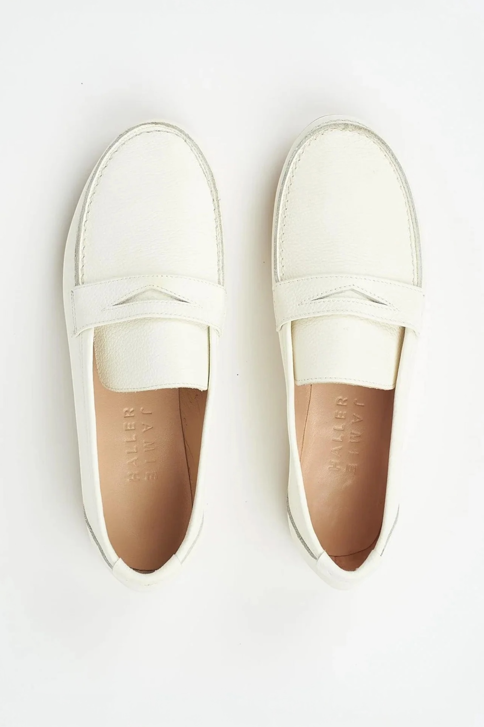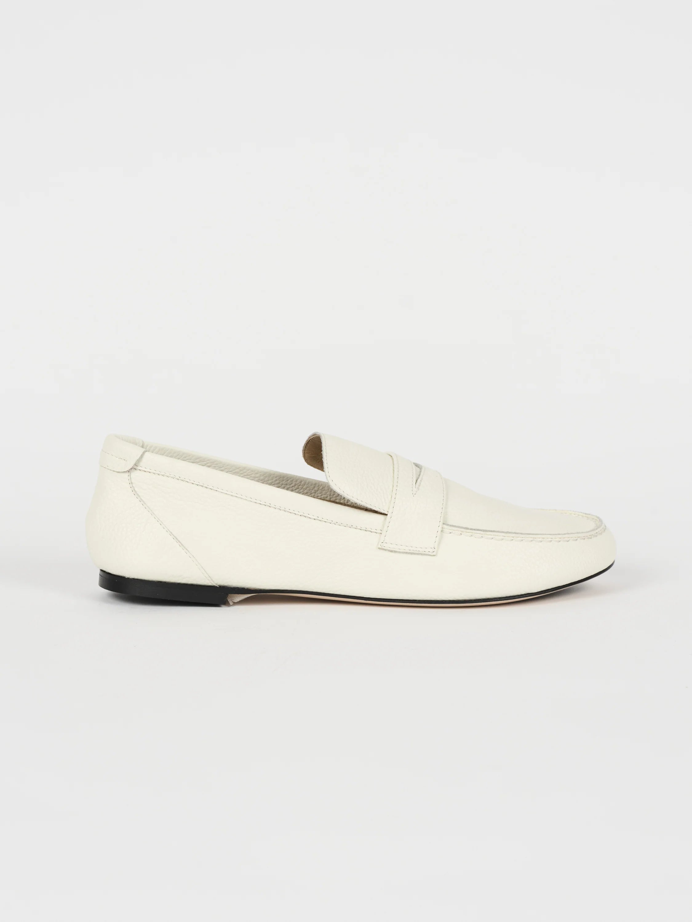 This Penny loafer is white with a black sole for a high contrast graphic element. The previous version of our white penny loafer from Spring 2025 and before, had a natural colored tan sole."