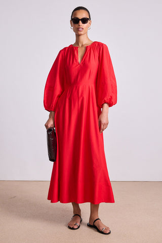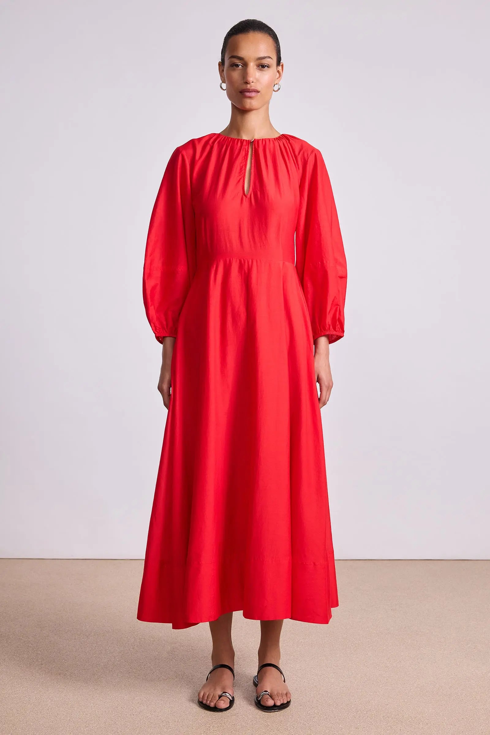 - Lantern sleeves, gathered crew neck with keyhole, fitted through the waist and flares out to A-line skirt, hook and eye closure