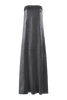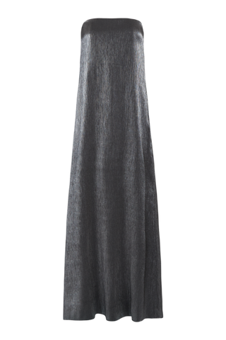 Strapless maxi dress in splintered metallic viscose. Fabric is stretch viscose with a metallic sheen and woven texture that reflects light and adds dimension. Carolyn’s Gown is a floor length, fluid shift silhouette with a slit at the back hem. Complete with a concealed zip at the back.