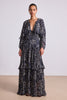 • Flowy gown length dress with removable slip, crew neck with center front slit and button/loop closure, balloon sleeve with elastic at opening, tiered maxi skirt, removable self tie belt