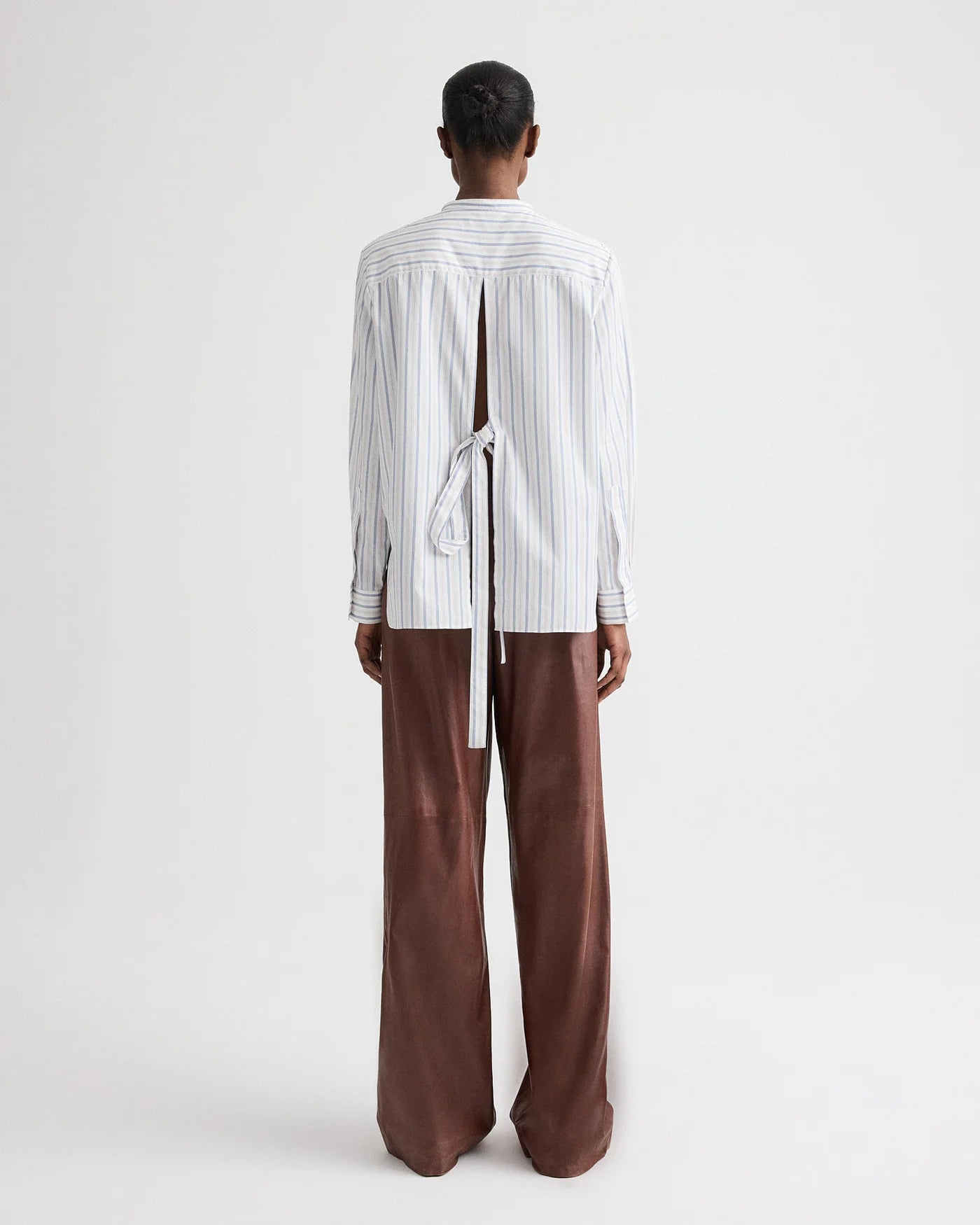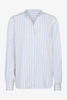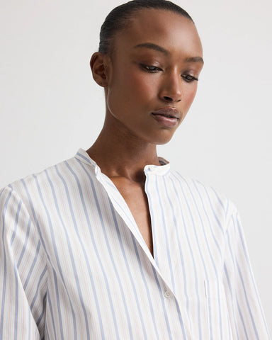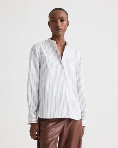Relaxed button-down in superfine Italian cotton shirting with a mini awning stripe. Designed with a band collar and a back opening finished with an adjustable tie. Finished with a button-front placket, chest patch pocket, and long sleeves with cuffs.