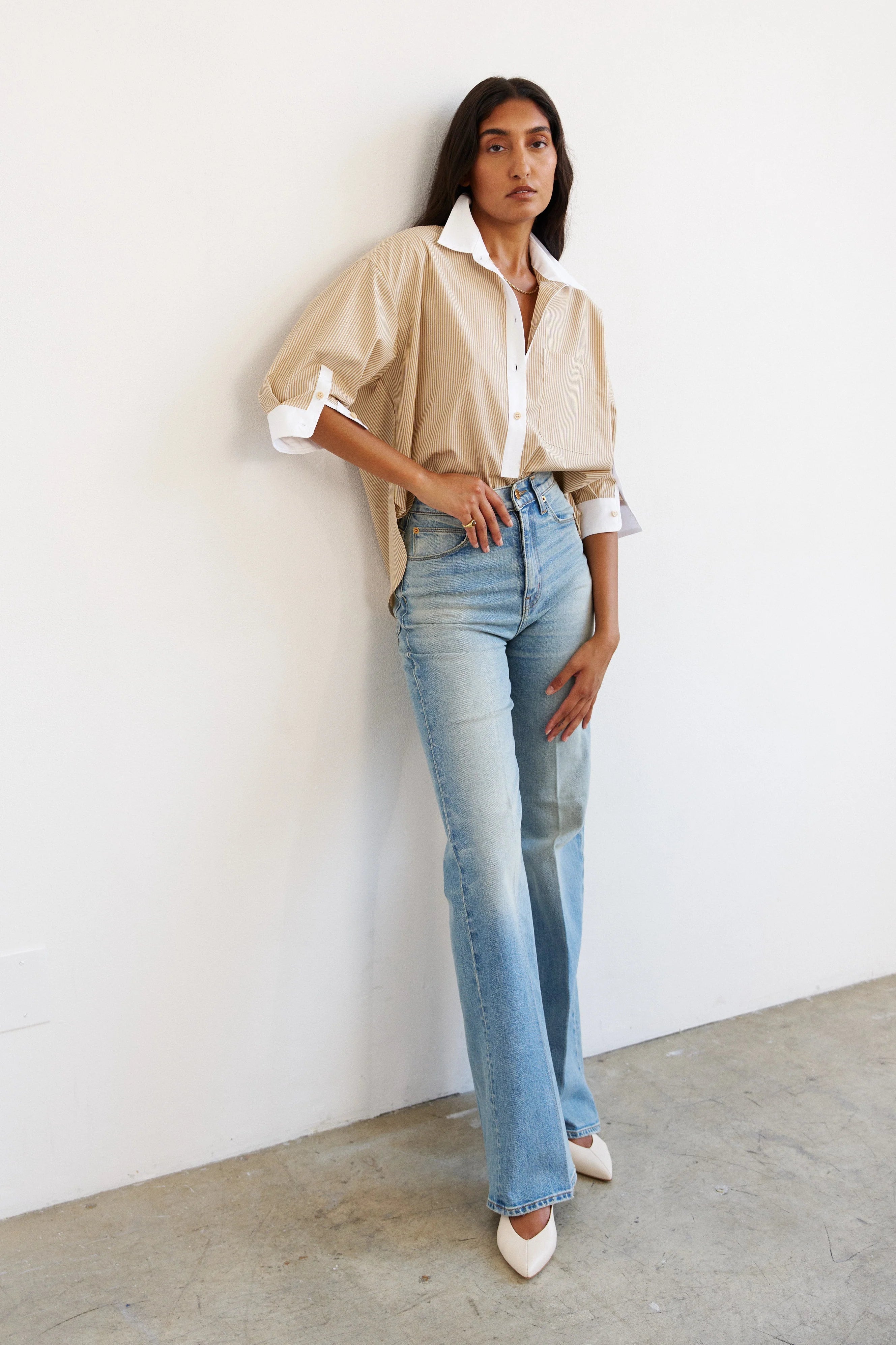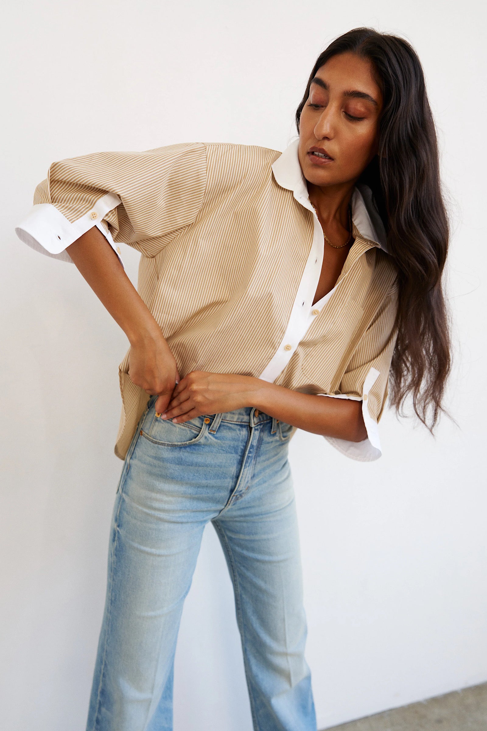 A billowy popover shirt with elbow length cuffed sleeve detail. Pops at the collar and cuff. Cropped for easy tuck ins and half tucks.