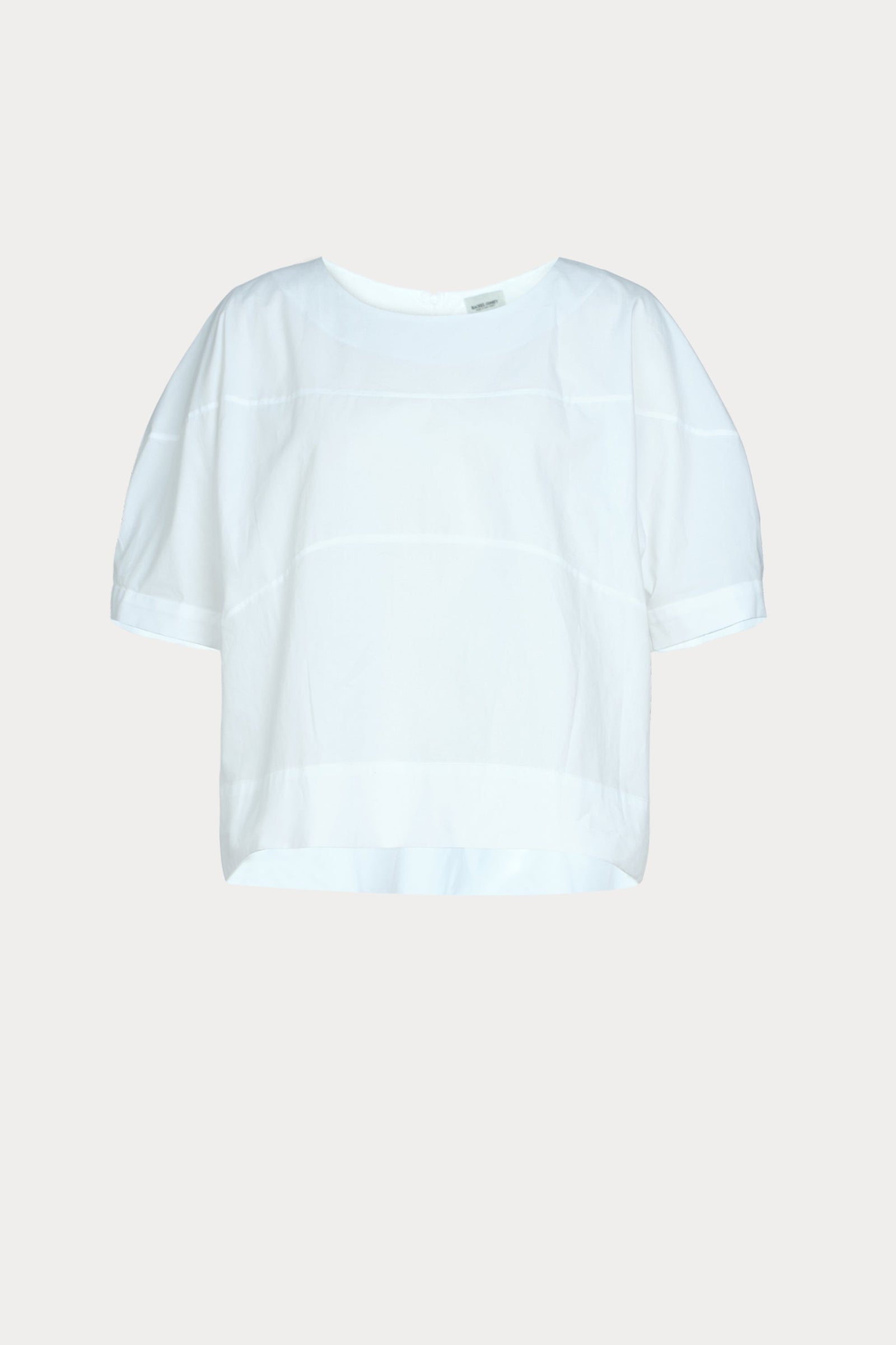 Boxy short-sleeve top with a clean crew neckline, dropped shoulders, and a straight, easy silhouette. Designed with subtle panel seaming across the body and sleeves, finished with a clean hem for everyday wear. Cut from organic Portuguese cotton in a smooth, durable plain weave with a dry, crisp hand and subtle sheen.