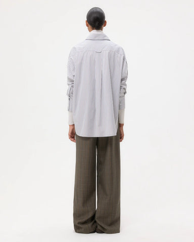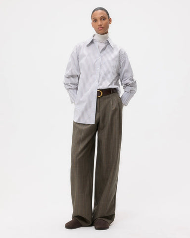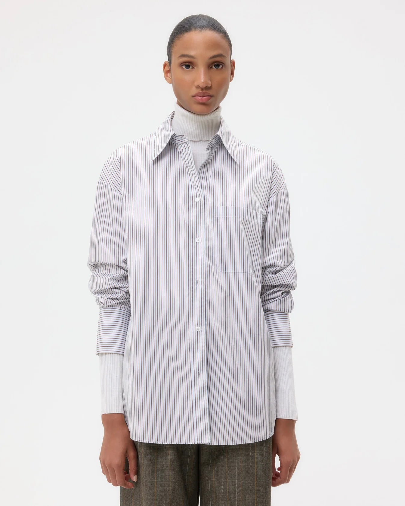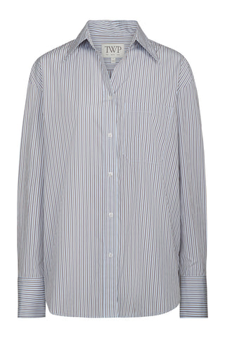 Oversized shirt in Italian cotton stripes. This fabric has bold stripes woven into our signature lightweight poplin shirting. The Big Joe is a menswear inspired, relaxed button down. Complete with a chest patch pocket, button up placket, french cuffs and a tulip hem.