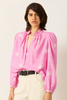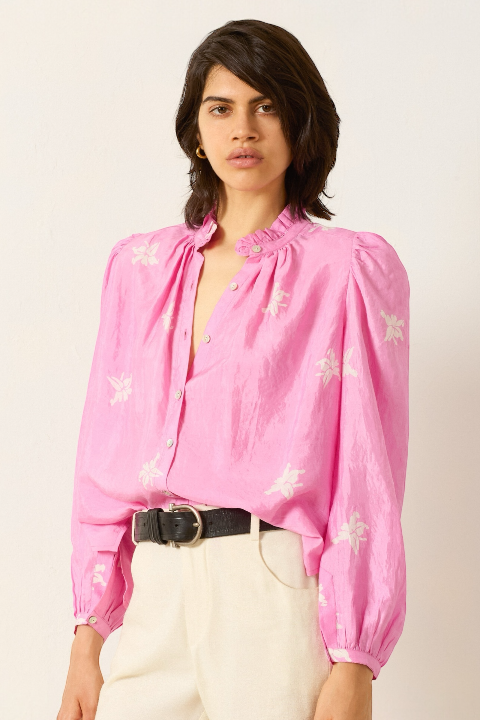 The Annabel Shirt features soft puff shoulders and a feminine ruffled collar with hand–block-printed in an asymmetrical floral motif.