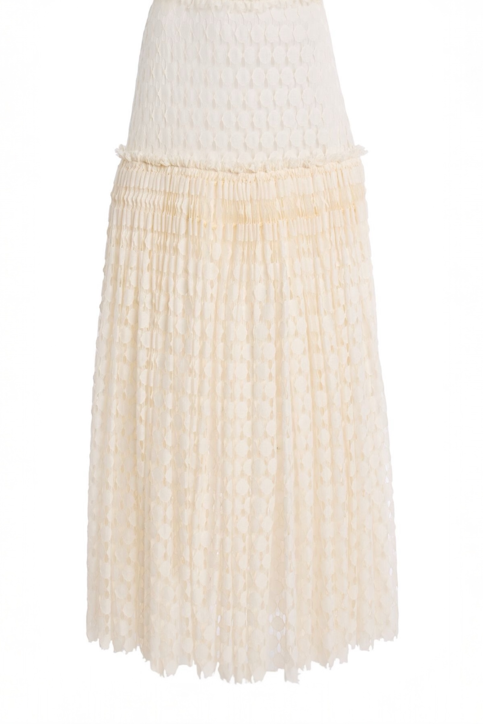 The Aris Skirt reinterprets lace traditions, inspired by a heritage needle lace from Alençon, France. This Chalk white skirt is alive in geometric openwork that references pointillism art and gracefully unveils at every step.