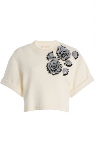 Cut from soft French terry, the Cove top features a relaxed, boxy silhouette with short sleeves and subtle floral embroidery detailing, offering an easy, modern counterpoint to the collection’s expressive printComposition: 100% Cotton