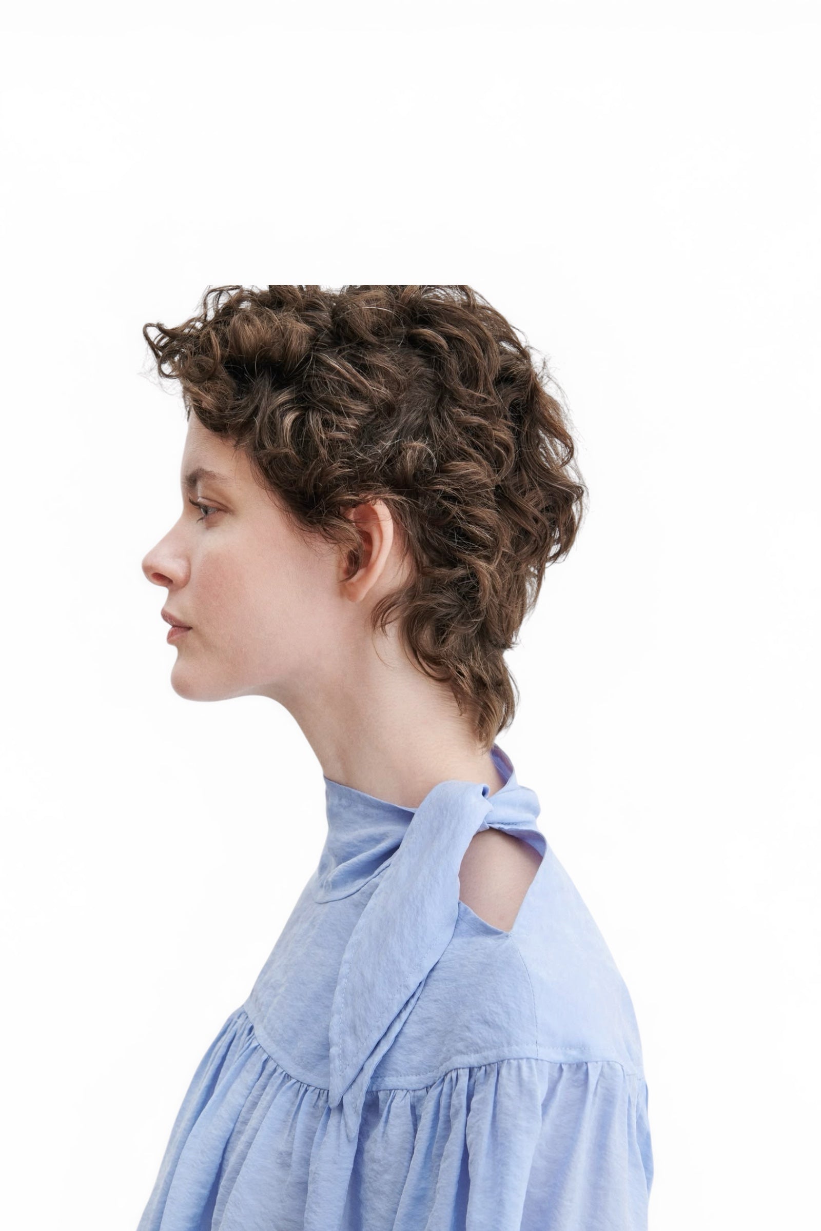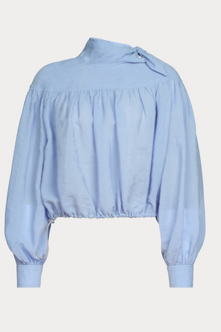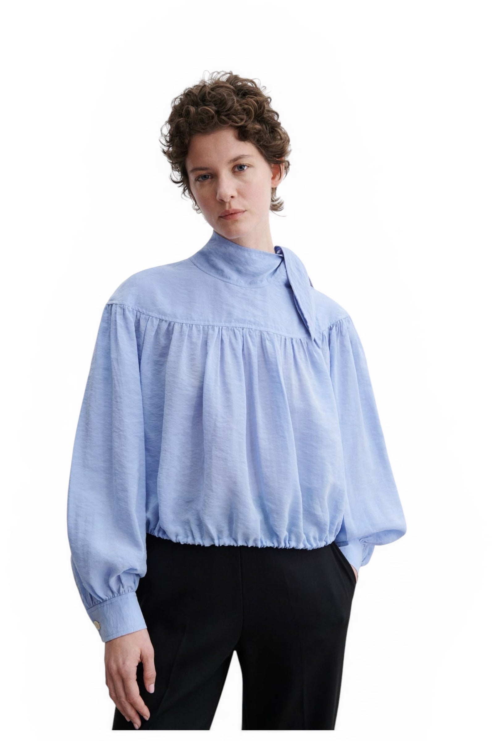 Softly voluminous long-sleeve blouse with a gathered yoke, relaxed drape, and elasticated hem that blouses gently at the waist. Designed with a high neckline finished with an extended tie detail, subtle back gathering, and buttoned cuffs for shape and structure. Cut from our lightweight, wrinkle-resistant Poppy cupro with a crisp hand and soft pebble texture—ideal for packing and travel.