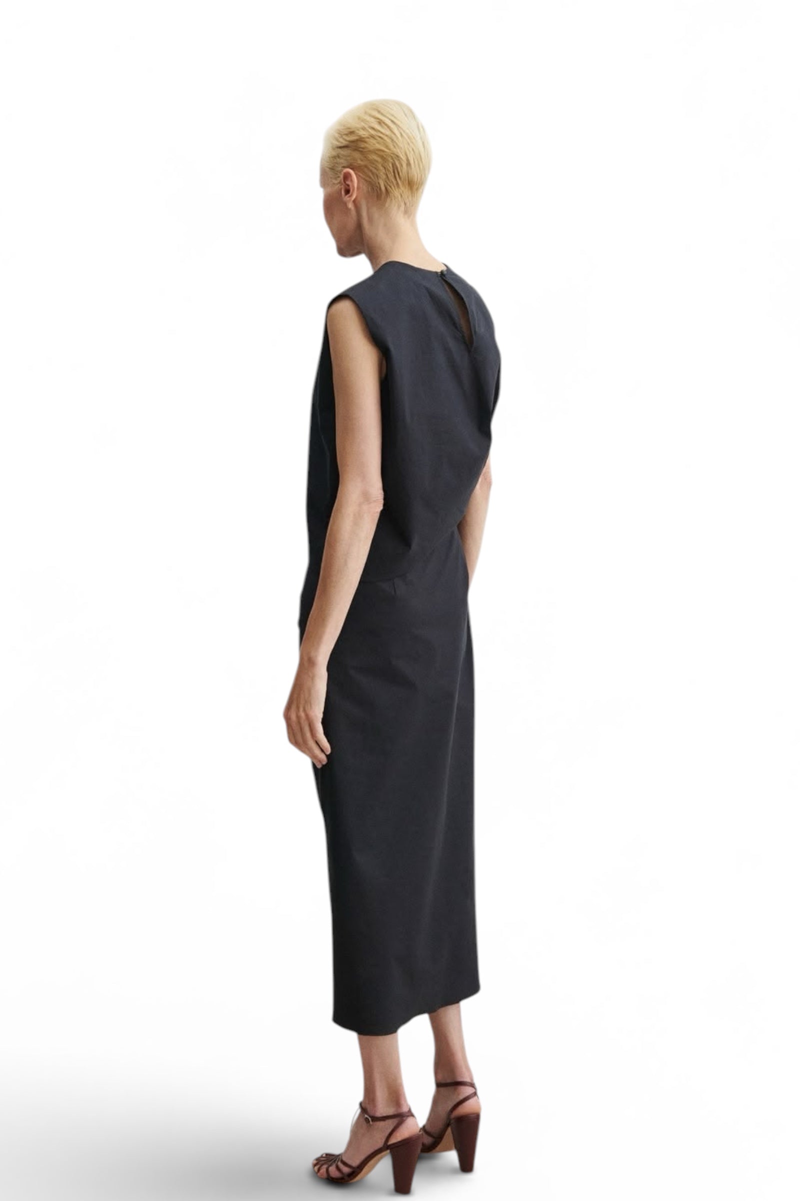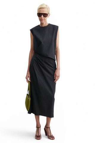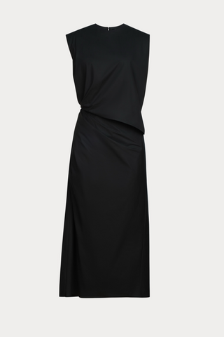 Midi dress cut from lightweight crisp stretch fabric. Features a crew neckline, cap sleeves, and a tailored fit with gentle gathering at the side.