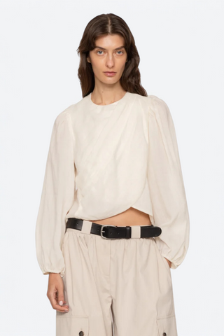 The Solene long sleeve top features voluminous puff sleeves and asymmetrical pleating for a textured detail. A tulip hem completes the design, adding a feminine touch.