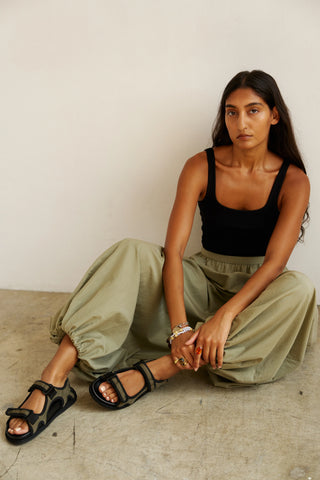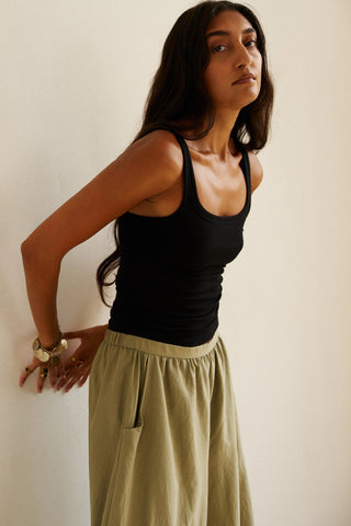 A slim rib tank with a wide softly rounded slightly squared neckline. Slim straps. Tailored in modal spandex 1 x 1 rib.